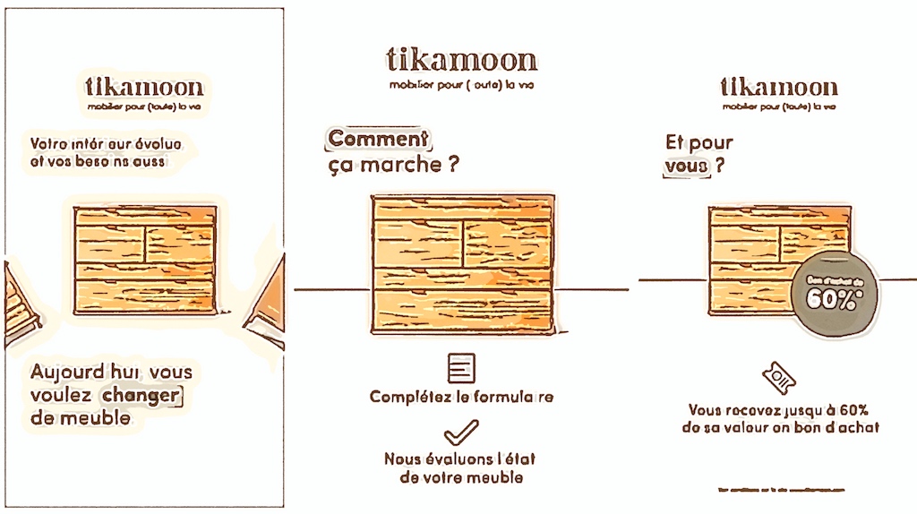 Les clients complètent un formulaire en ligne pour faire évaluer leur meuble. Le montant du rachat varie selon l’état : 60% du prix d’origine pour un meuble en très bon état, 50% en bon état, et 30% en état moyen. Le bon d’achat est valable un an sur le site Tikamoon ou à la boutique circulaire.​